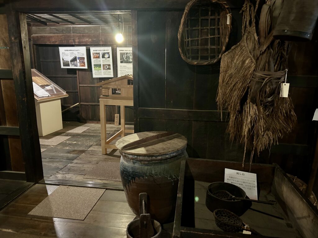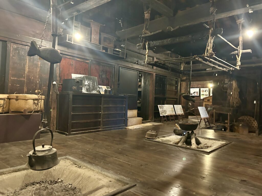 広い土間と囲炉裏、黒光りする梁、天井から吊るされた道具。華やかさはありませんが、長い年月を過ごしてきた家特有の重みがあります。