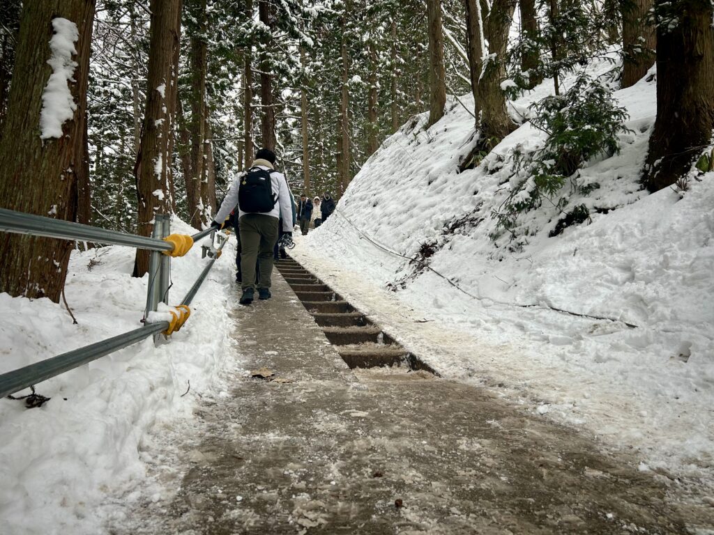 後ほど触れますが、傾斜と階段に雪が踏み固められ、かつ日中も日光は当たらず地面の温度も低いため、シーズン通して非常に滑りやすいになっていますので細心の注意が必要です。