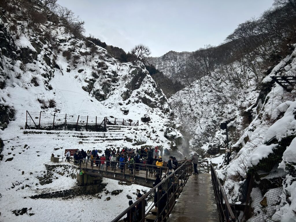 雪道を長く歩いた後での階段は多少のキツさもありますが、ここさえ越えればチケット売り場、温泉への入口は目の前です。